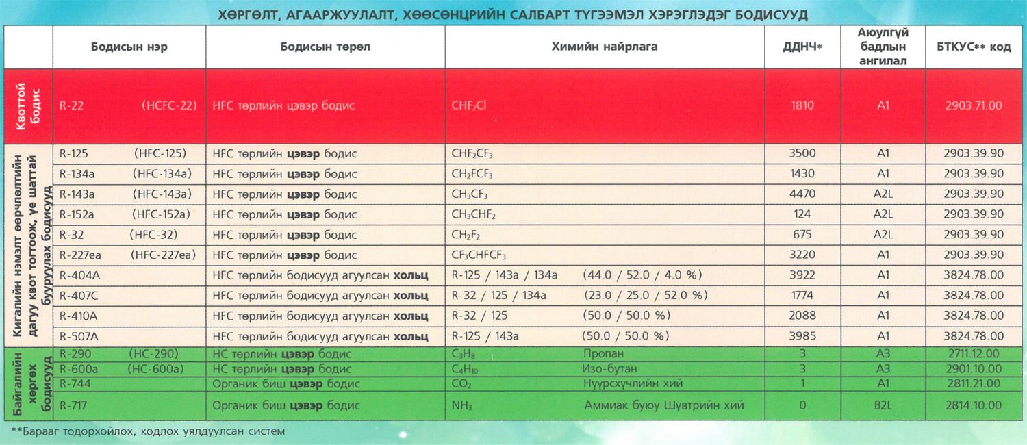 Бүх төрлийн ахуйн зориулалттай хөргөгч, хөлдөөгч, үйлдвэрийн зориулалтын хөргүүр нь "фреон" гэх хөргөлтийн шингэн агуулсан байдаг. Эдгээр шингэн нь ФТОРХЛОРТ НҮҮРСТӨРӨГЧ гэх бүлэг химийн нэгдэл бөгөөд, химийн нэршлээр нь тэмдэглэхээс гадна найрлаганд нь орсон нэгдлийн эхний том үсгээр /HCFC гэх мэт/, эсвэл R -дугаар гэсэн байдлаар товчлон тэмдэглэнэ.