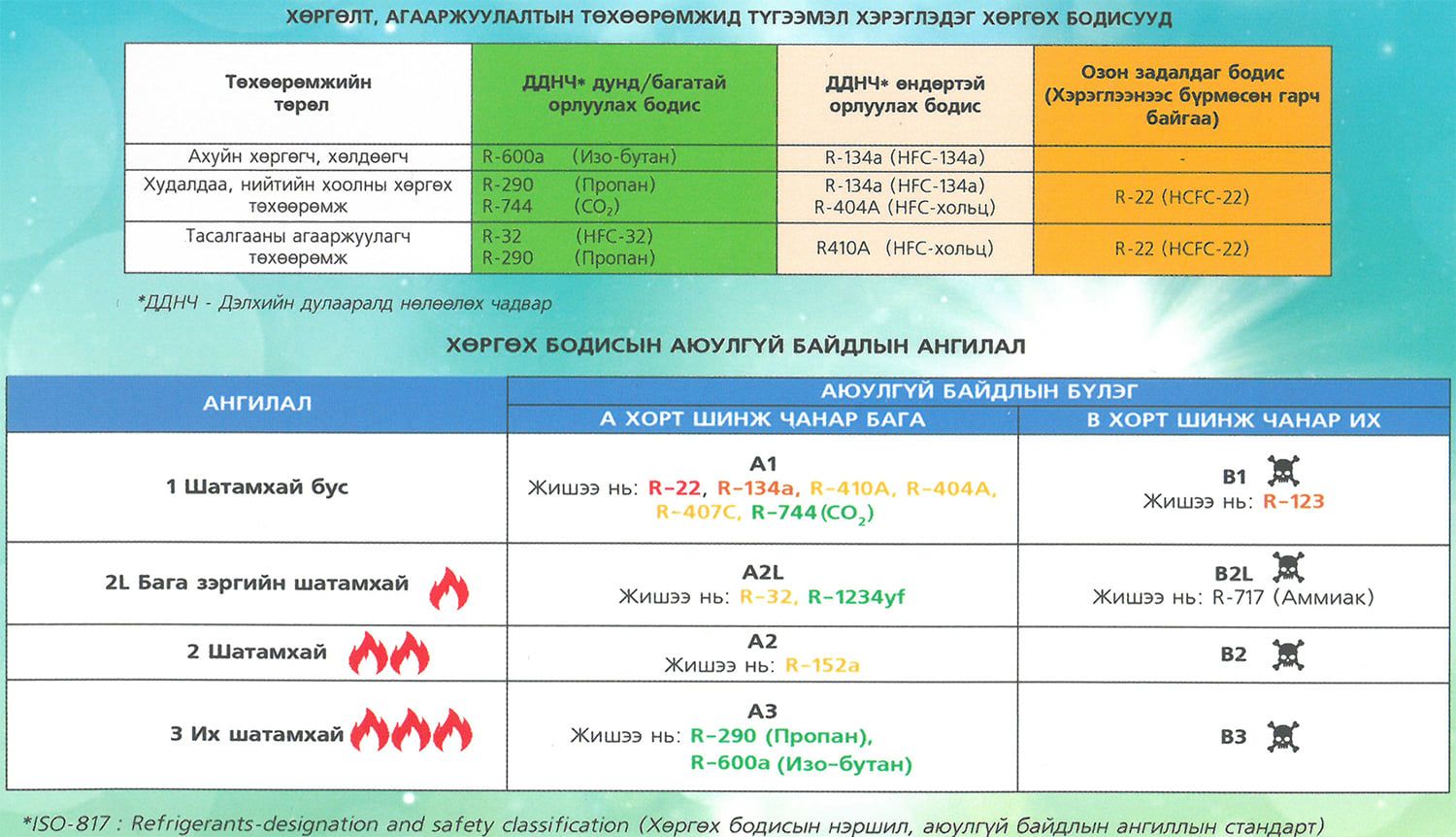 Бүх төрлийн ахуйн зориулалттай хөргөгч, хөлдөөгч, үйлдвэрийн зориулалтын хөргүүр нь "фреон" гэх хөргөлтийн шингэн агуулсан байдаг. Эдгээр шингэн нь ФТОРХЛОРТ НҮҮРСТӨРӨГЧ гэх бүлэг химийн нэгдэл бөгөөд, химийн нэршлээр нь тэмдэглэхээс гадна найрлаганд нь орсон нэгдлийн эхний том үсгээр /HCFC гэх мэт/, эсвэл R -дугаар гэсэн байдлаар товчлон тэмдэглэнэ.